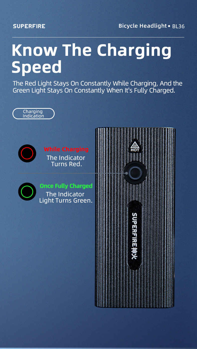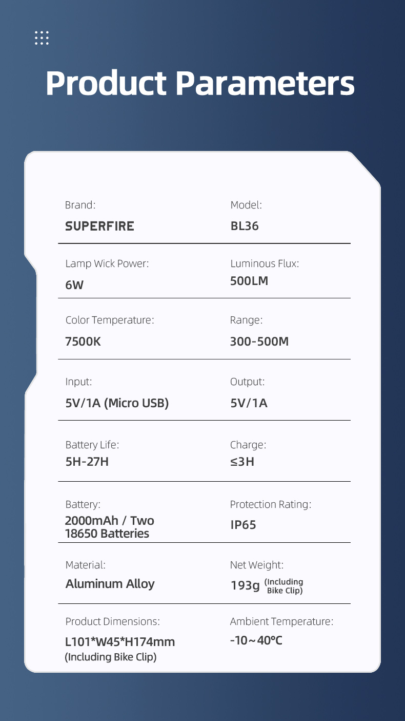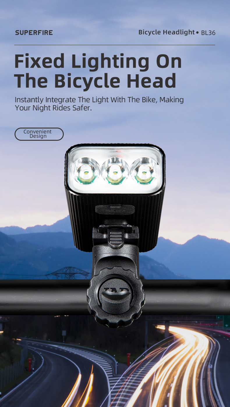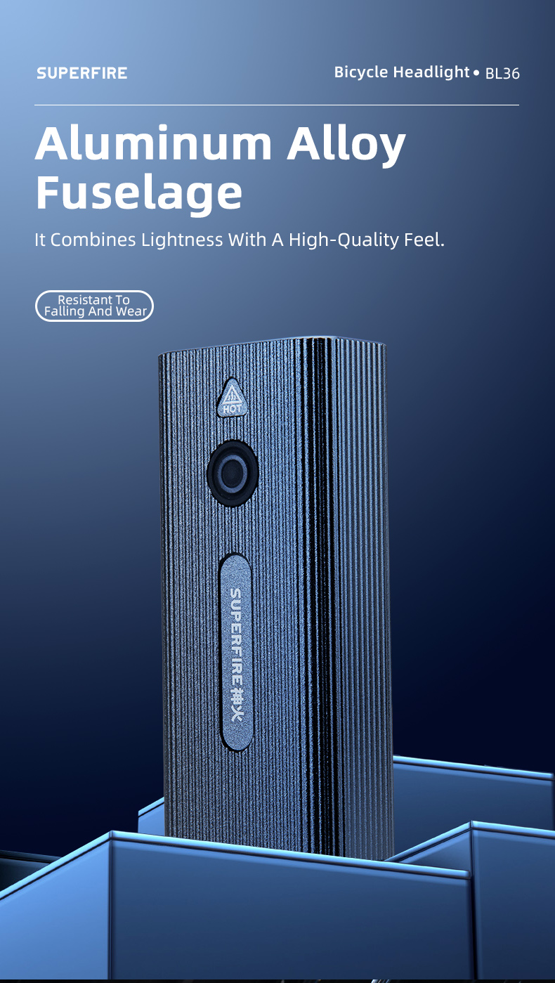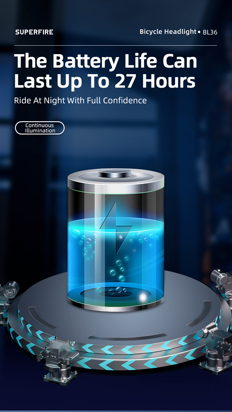 O BL36 é uma luz frontal de bicicleta de alto brilho com 500 lúmens. Ele tem uma bateria de lítio 4000 mAh embutida, que pode fornecer uma vida útil da bateria de 5 horas sob a condição de brilho mais alto. Seu alcance máximo pode atingir até 500 metros. Com uma classificação de proteção IP65, ele pode lidar facilmente com vários ambientes agressivos. Portanto, este é um produto adequado para ciclismo de longa distância.