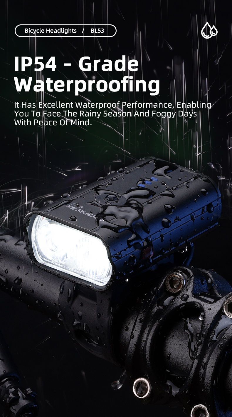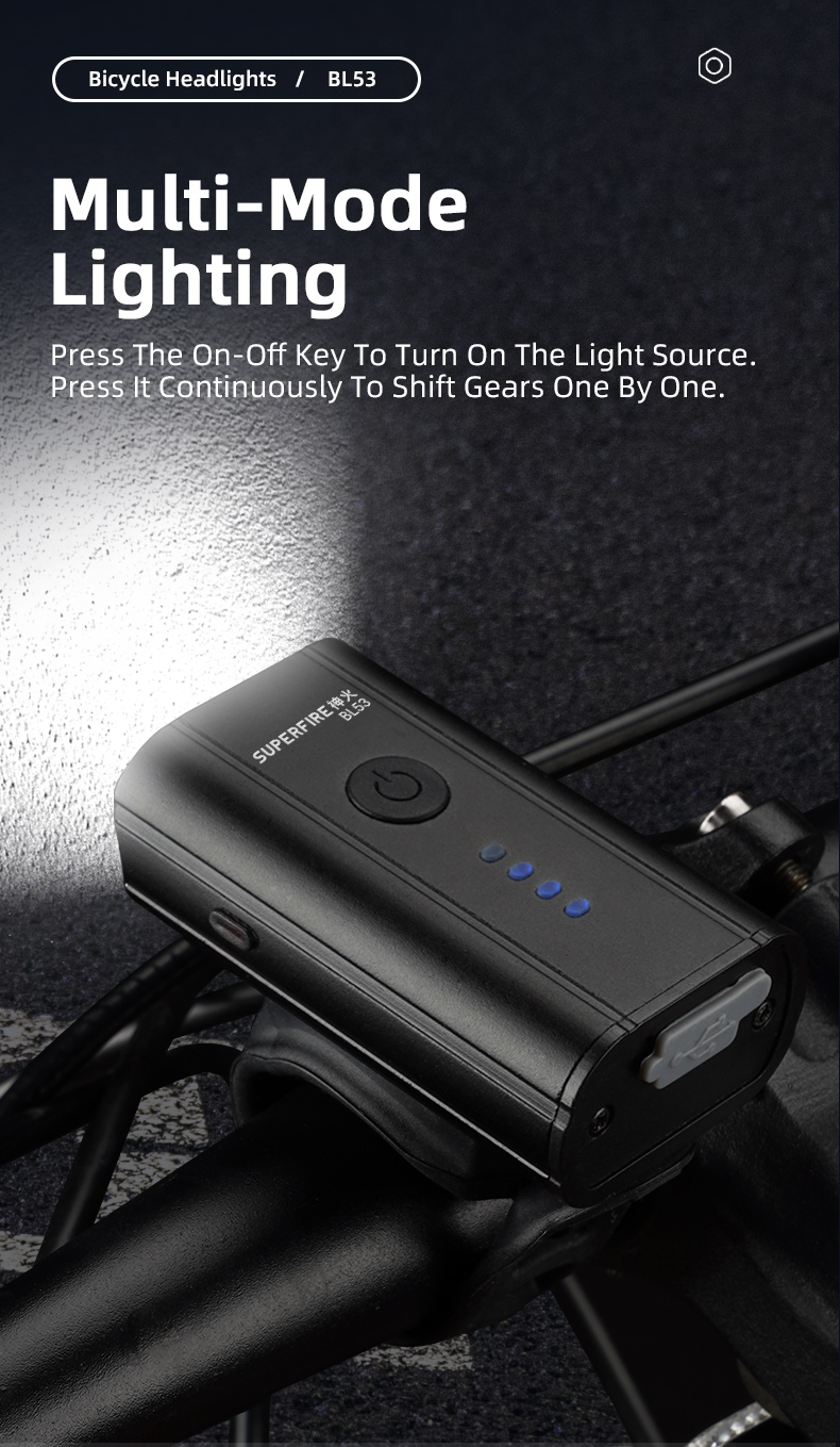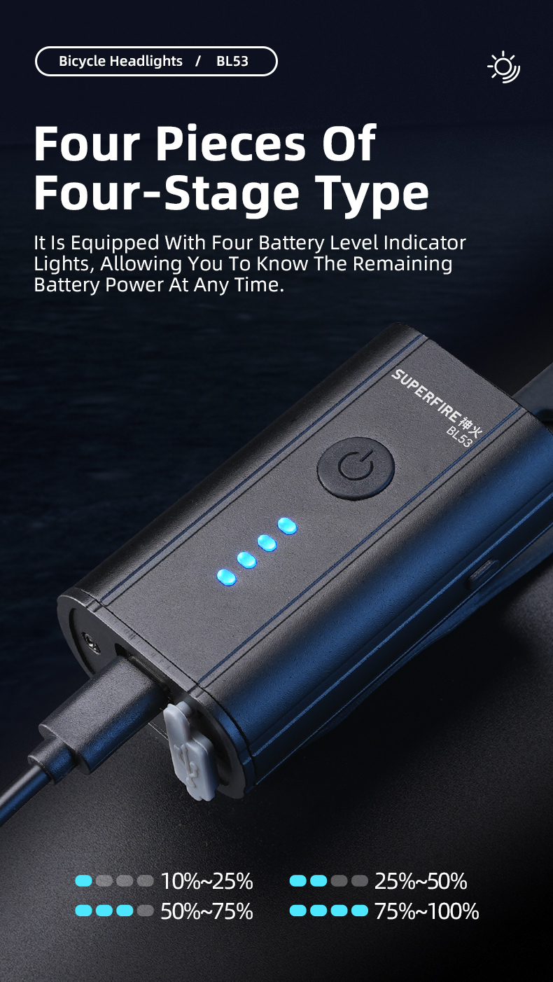 O BL53 é uma luz frontal de bicicleta com um brilho de 350 lúmens. É equipado com uma bateria de lítio embutida de 4000 mAh, que pode fornecer uma vida útil da bateria de 5 horas sob a condição de maior brilho. Seu alcance máximo pode atingir até 500 metros. Possui dois modos de iluminação, a saber, o modo de iluminação de curto alcance e o modo de projeção de longa distância, que pode evitar perturbar a visão de outras pessoas e reflete o respeito pela ordem pública. Esta luz também vem com um indicador de nível de bateria, tornando conveniente para os usuários verificar o status da bateria a qualquer momento e garantindo uma viagem sem preocupações.
