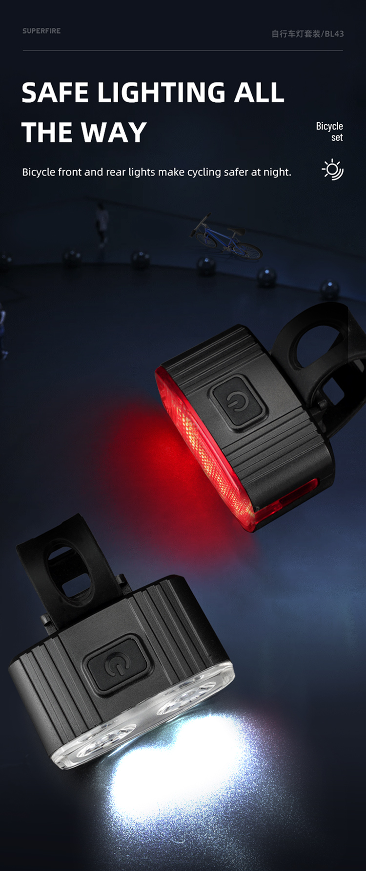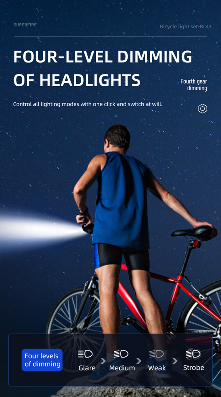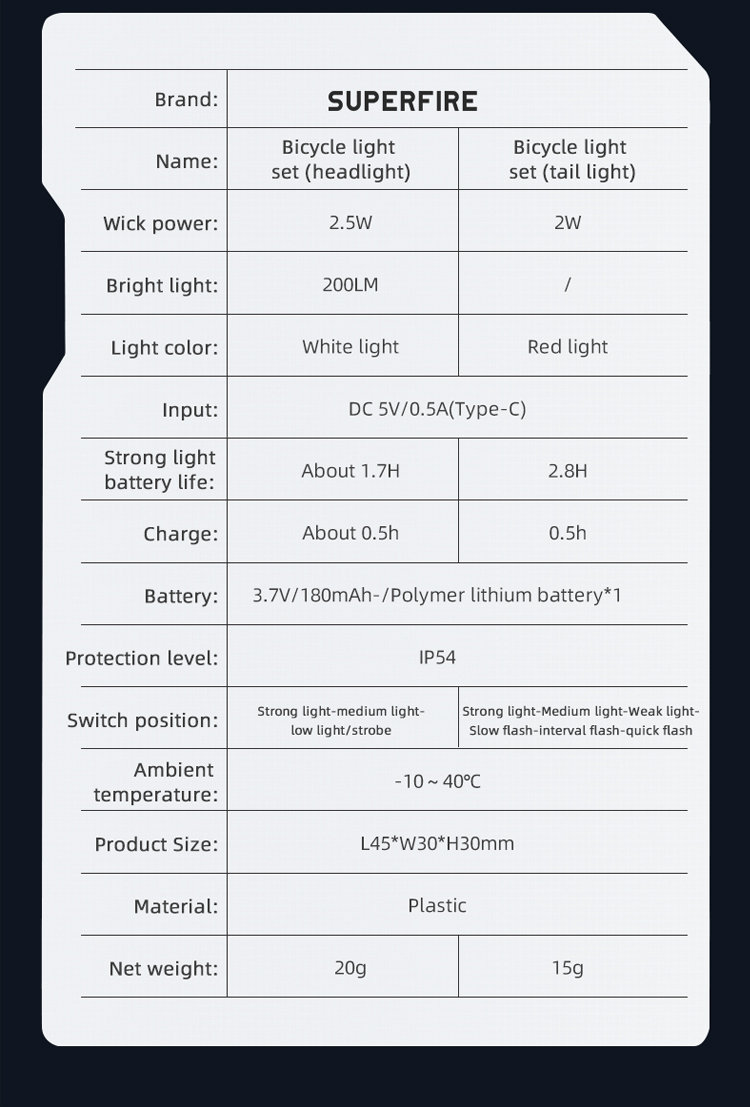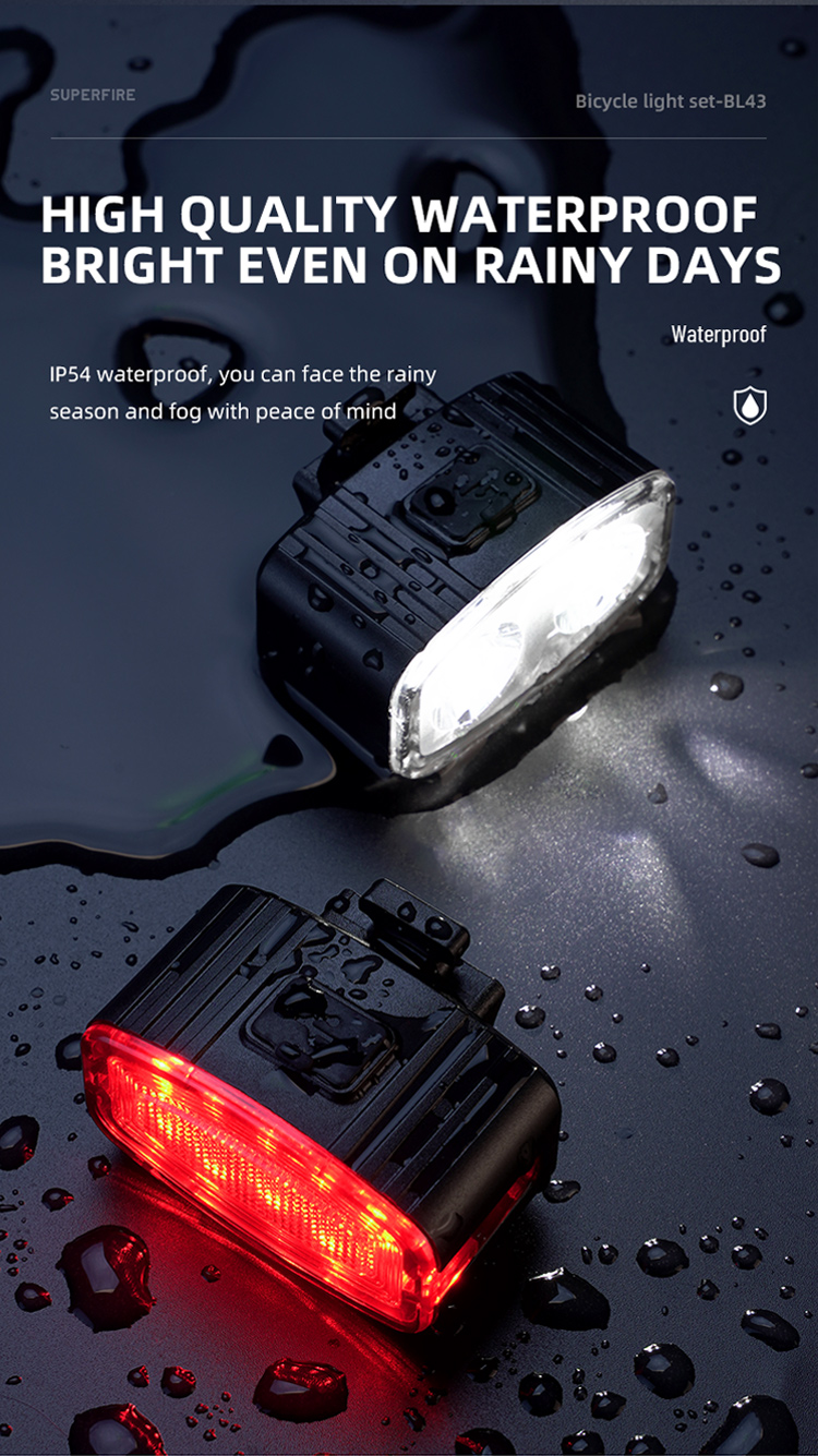 Apresentando a série SUPERFIRE LED recarregável de luz frontal de bicicleta e luz traseira BL43: uma luz de bicicleta compacta e recarregável projetada para segurança e visibilidade durante a condução. A luz vermelha de advertência do veículo traseiro fornece seis modos: Alta, Média, Baixa, Flash Lento, Flash Interval e Flash Rápido, A luz branca frontal fornece 4 modos de iluminação: Alta, Médio, Baixo, Strobe.IP54 à prova d'água, você pode andar com segurança mesmo em noites chuvosas. Fácil instalação, adequado para qualquer bicicleta. Ideal para passageiros ou ciclistas recreativos que buscam iluminação e visibilidade confiáveis à noite ou em condições de pouca luz. Este conjunto de luzes é projetado para fornecer aos ciclistas um equilíbrio entre desempenho, portabilidade e acessibilidade.