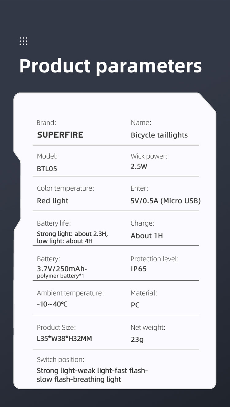 Apresentando a luz de cauda de bicicleta LED recarregável SUPERFIRE BTL05: compacta e leve, apenas 23g de peso. Não são necessárias ferramentas, Se encaixa diretamente na bicicleta. Luzes de advertência piscando tornam a condução mais segura. IP65 à prova d'água, não precisa se preocupar com dias chuvosos ou nebulosos. Carregamento USB com 1 hora de tempo de carregamento, a duração da bateria é de cerca de 2,3 horas em luz forte e cerca de 4 horas em luz fraca. Perfeito para uma variedade de cenários, incluindo iluminação de bicicletas, atividades ao ar livre e até mesmo iluminação para animais de estimação. Melhore sua visibilidade e segurança com a luz traseira BTL05.