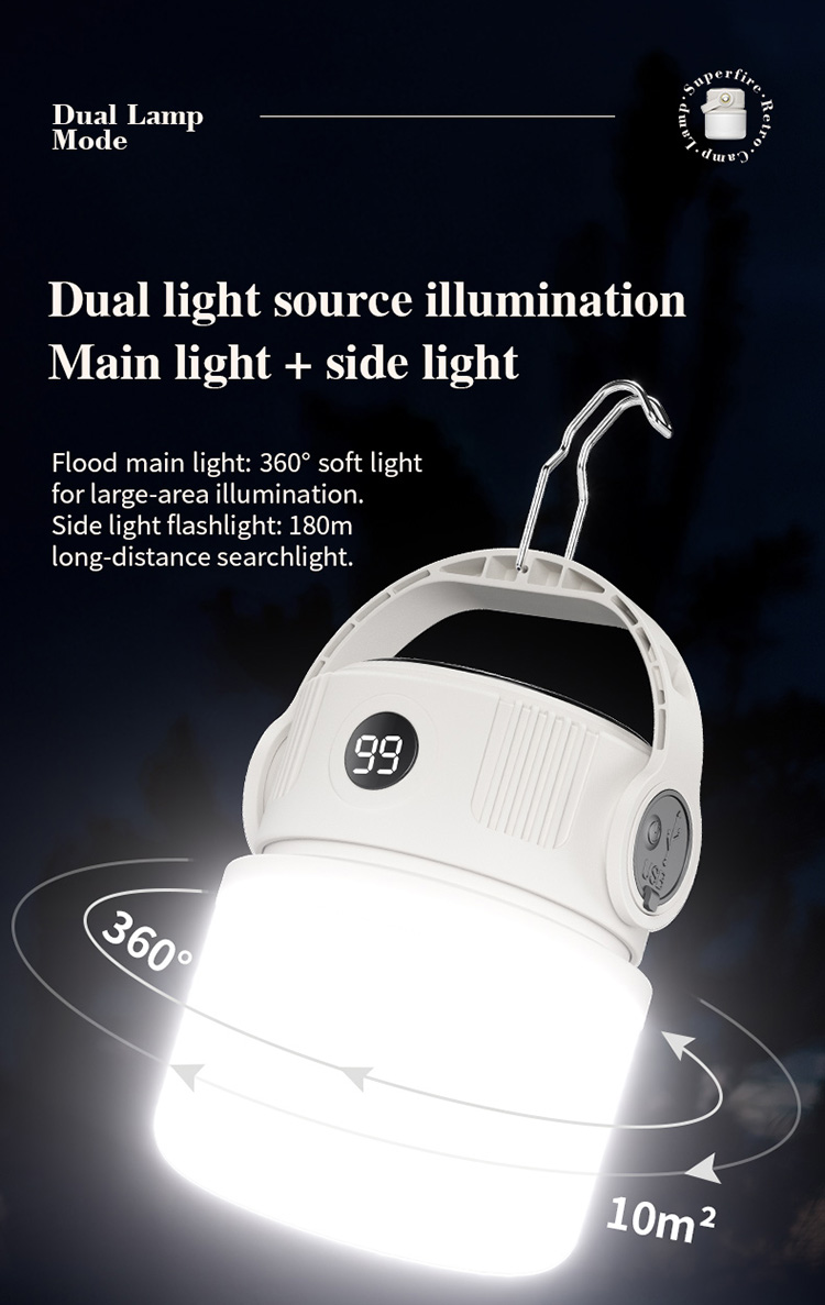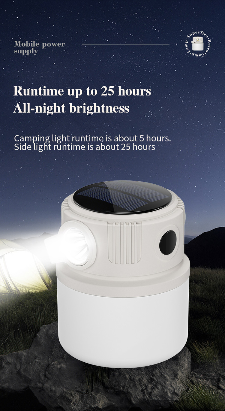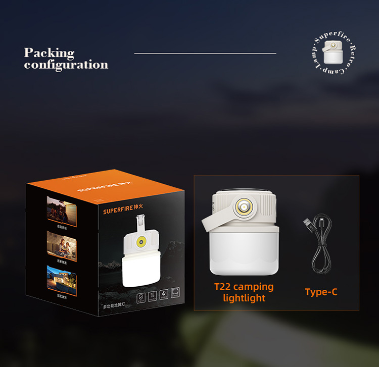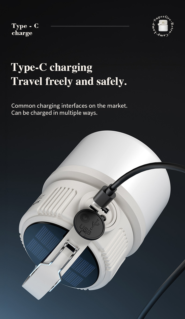 SUPERFIRE T22 é uma lanterna multifuncional de alta intensidade equipada com uma luz lateral com bateria ultra-longa. Ele pode ser usado continuamente por 25 horas, fornecendo suporte de iluminação estável e duradouro, e pode atender às necessidades de iluminação em vários ambientes extremos. Além disso, T22 não só suporta carregamento rápido através da interface Tipo-C, mas também tem uma função de banco de potência embutida, permitindo que você forneça o reabastecimento de energia de emergência para outros dispositivos ao viajar ao ar livre. Ele também tem um design de painel de carregamento solar, que pode lidar facilmente com emergências, como quedas de energia inesperadas. A lanterna está equipada com uma função de escurecimento de quatro velocidades, que pode ajustar livremente o brilho de acordo com diferentes cenas. Também é equipado com um design de gancho e uma estrutura rotativa de 360 °, o que é conveniente para fixação e uso de vários ângulos, proporcionando uma experiência de iluminação mais conveniente. Quer se trate de uso diário, aventura ao ar livre ou resgate de emergência, SUPERFIRE T22 será o seu assistente indispensável e confiável.