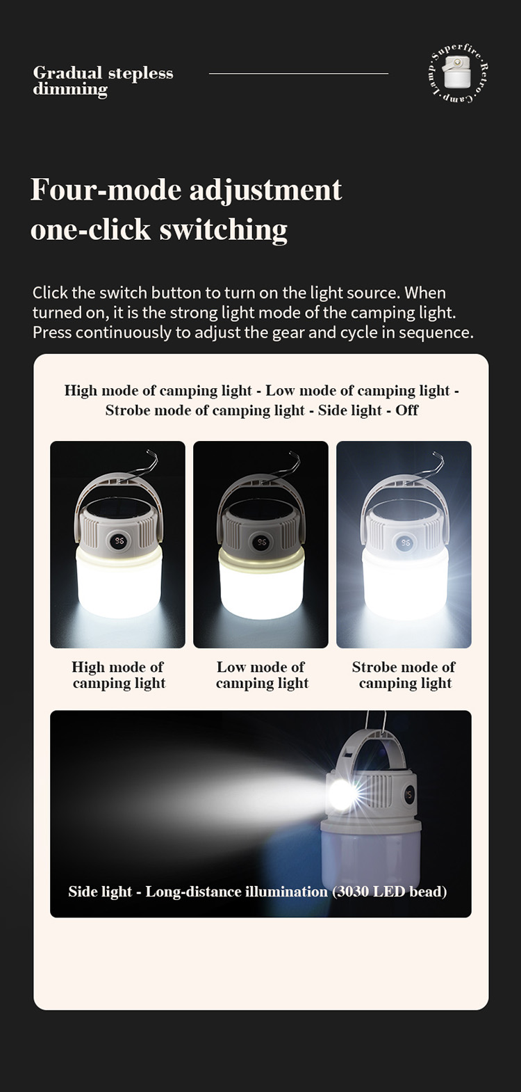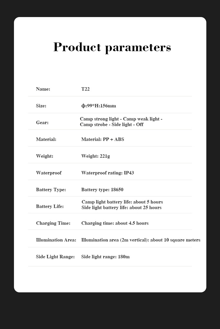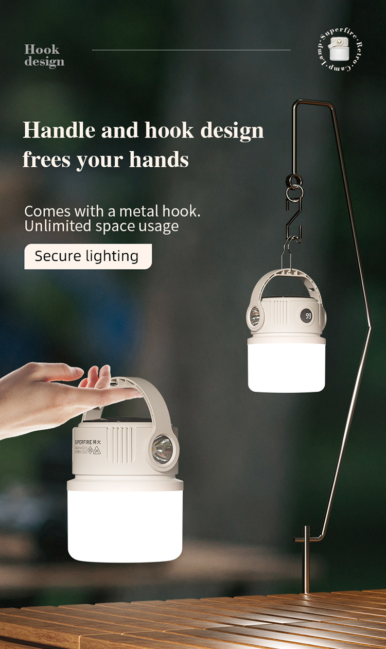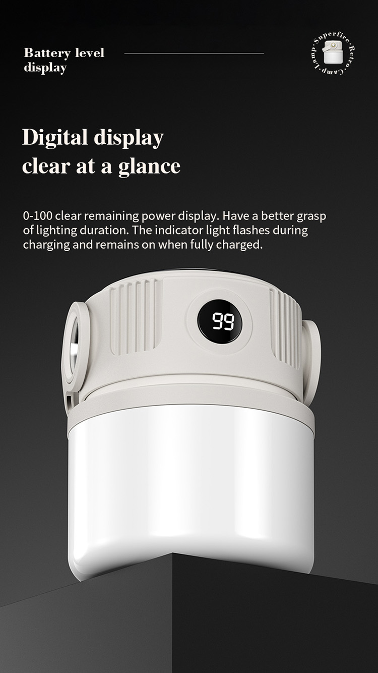 SUPERFIRE T22 é uma lanterna multifuncional de alta intensidade equipada com uma luz lateral com bateria ultra-longa. Ele pode ser usado continuamente por 25 horas, fornecendo suporte de iluminação estável e duradouro, e pode atender às necessidades de iluminação em vários ambientes extremos. Além disso, T22 não só suporta carregamento rápido através da interface Tipo-C, mas também tem uma função de banco de potência embutida, permitindo que você forneça o reabastecimento de energia de emergência para outros dispositivos ao viajar ao ar livre. Ele também tem um design de painel de carregamento solar, que pode lidar facilmente com emergências, como quedas de energia inesperadas. A lanterna está equipada com uma função de escurecimento de quatro velocidades, que pode ajustar livremente o brilho de acordo com diferentes cenas. Também é equipado com um design de gancho e uma estrutura rotativa de 360 °, o que é conveniente para fixação e uso de vários ângulos, proporcionando uma experiência de iluminação mais conveniente. Quer se trate de uso diário, aventura ao ar livre ou resgate de emergência, SUPERFIRE T22 será o seu assistente indispensável e confiável.